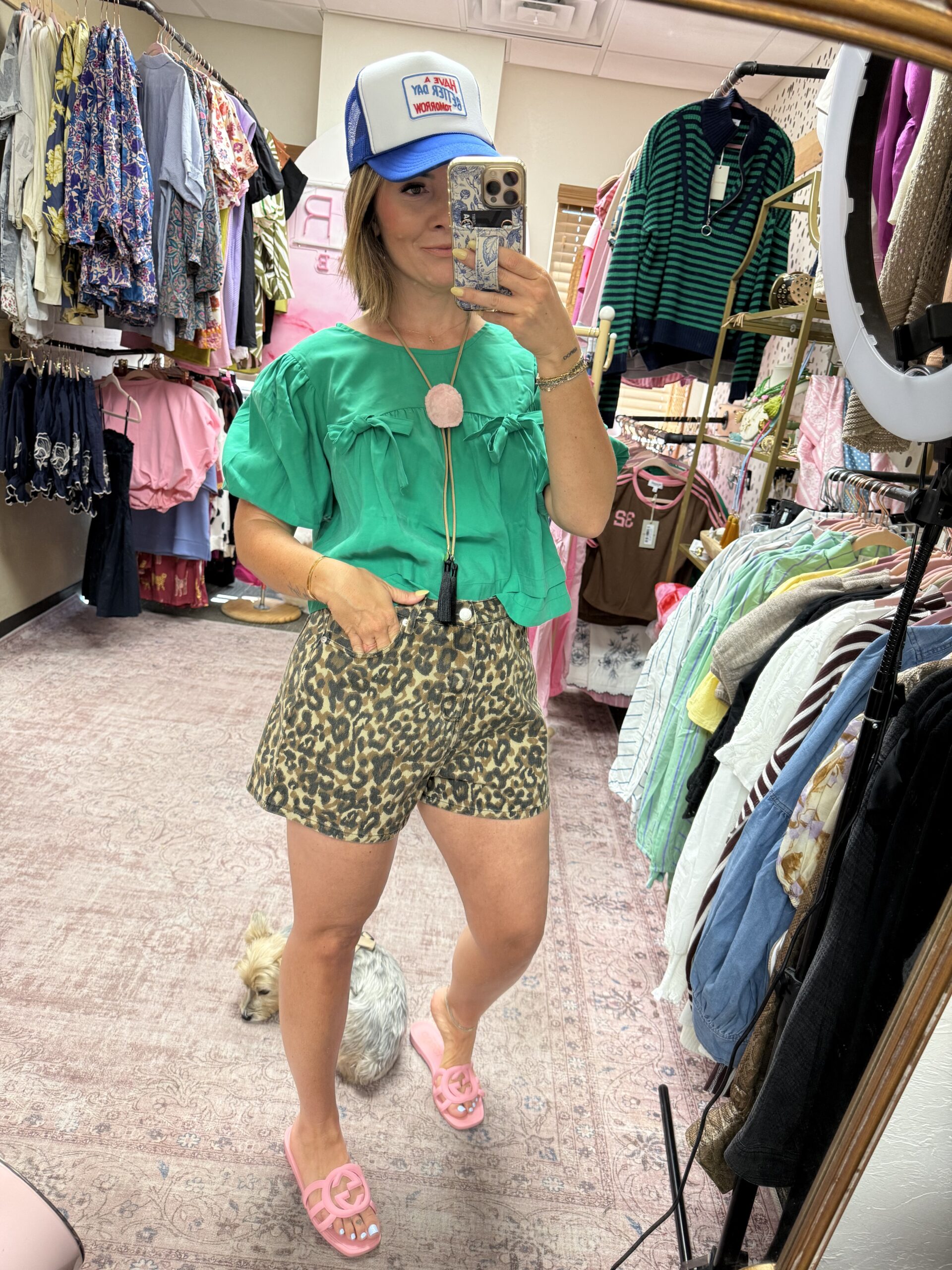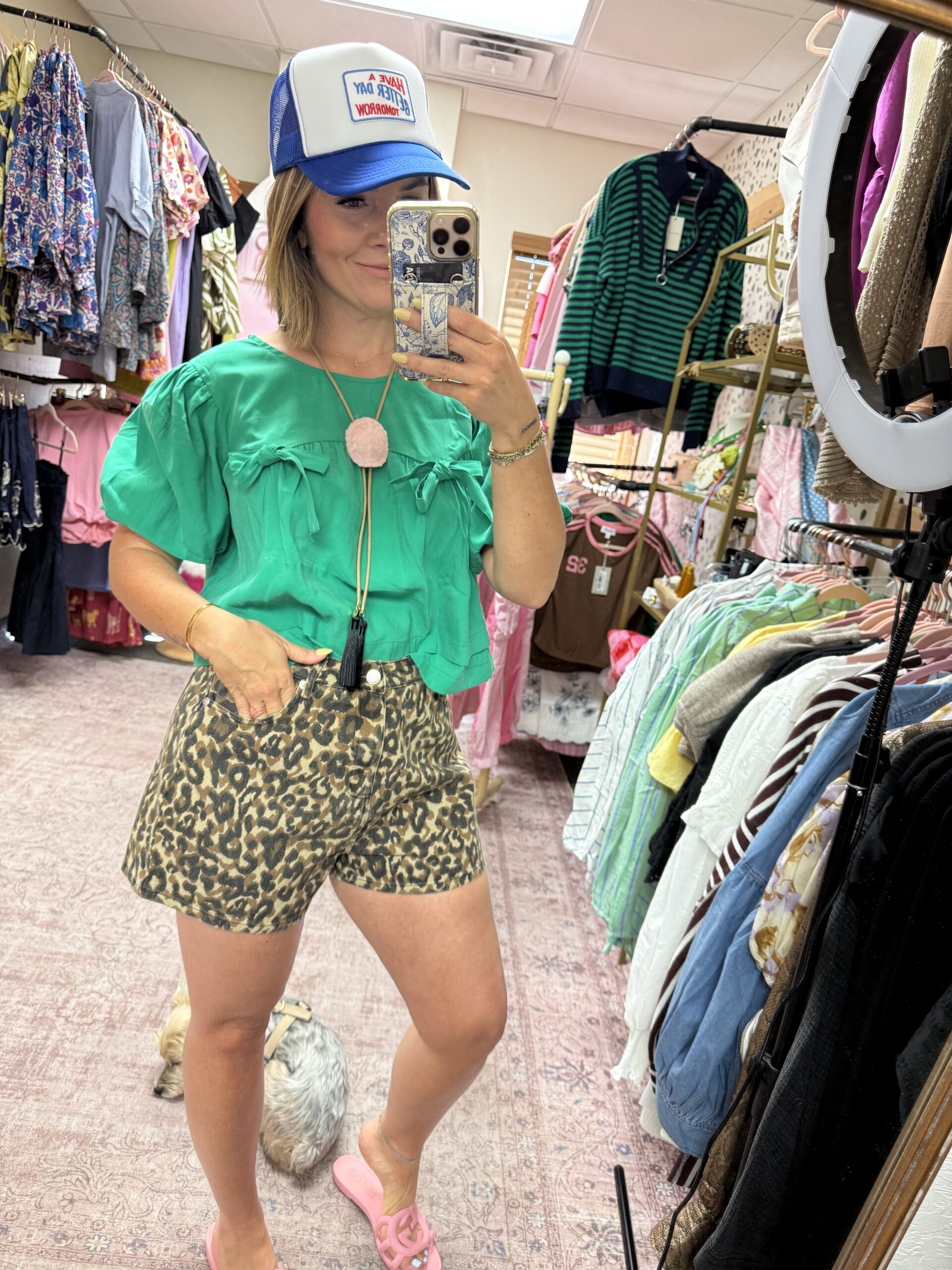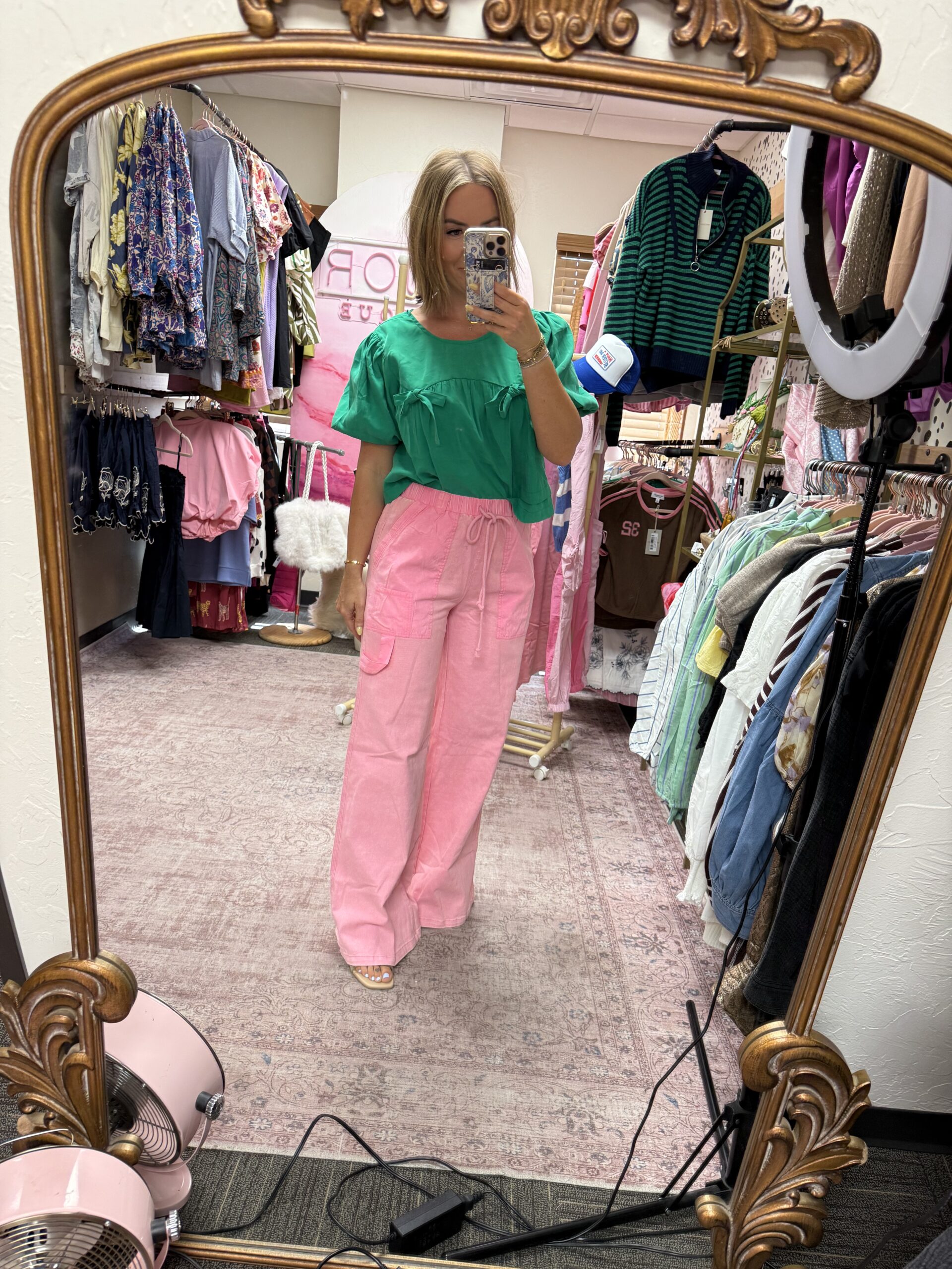 The sweetest pop of color for spring. This lightweight blouse features a relaxed, flowy fit with soft puff sleeves and delicate bow details across the front. Finished with a subtle keyhole tie closure in the back for an extra feminine touch. Easy to dress up or down and perfect for pairing with denim or statement bottoms like this.