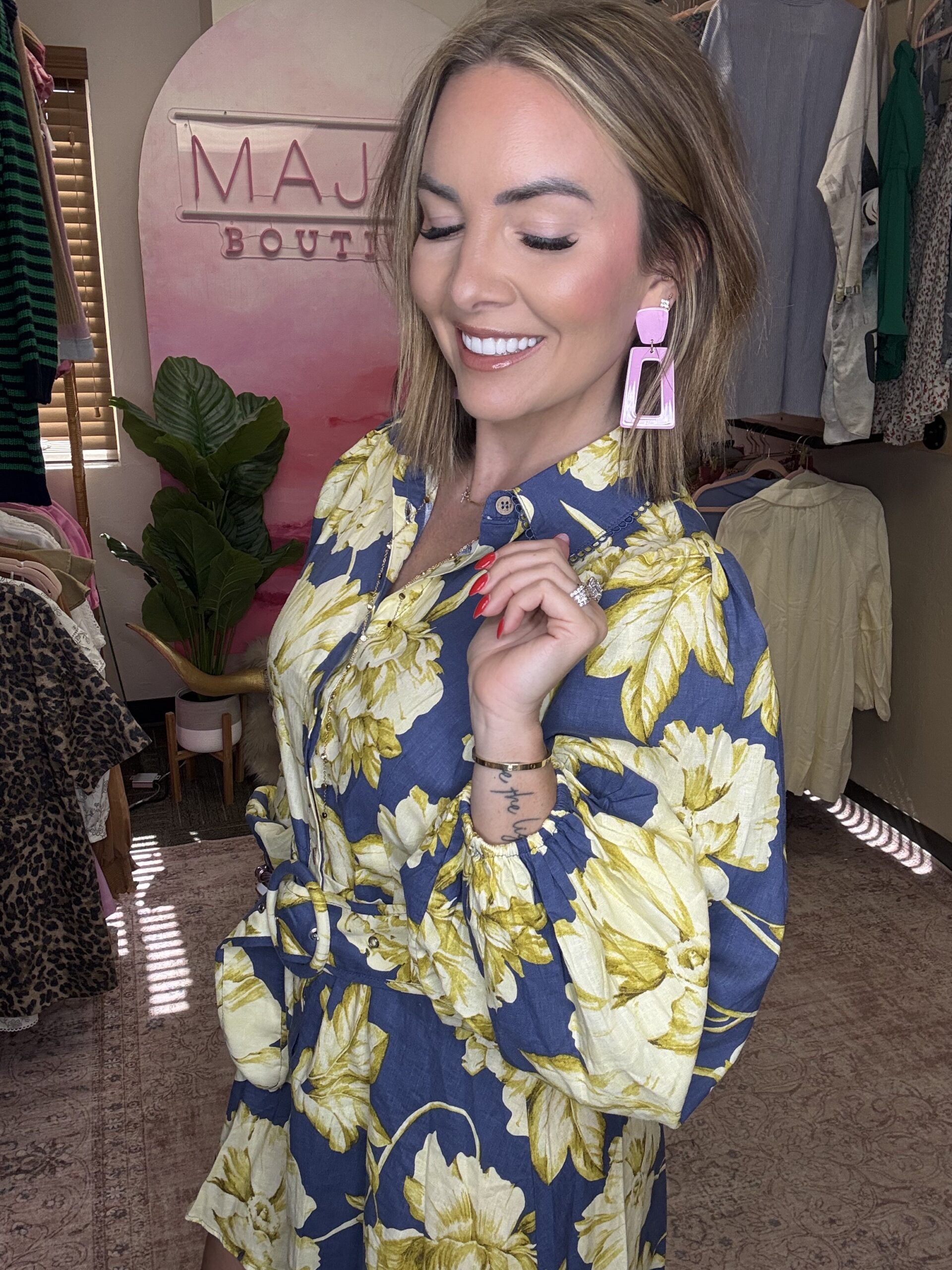 The ultimate statement floral 🌼✨ This navy shirt dress is covered in bold golden blooms that instantly brighten your look. It features a classic button-down front, structured collar, and a matching belt to cinch the waist for that flattering, feminine shape we all love.