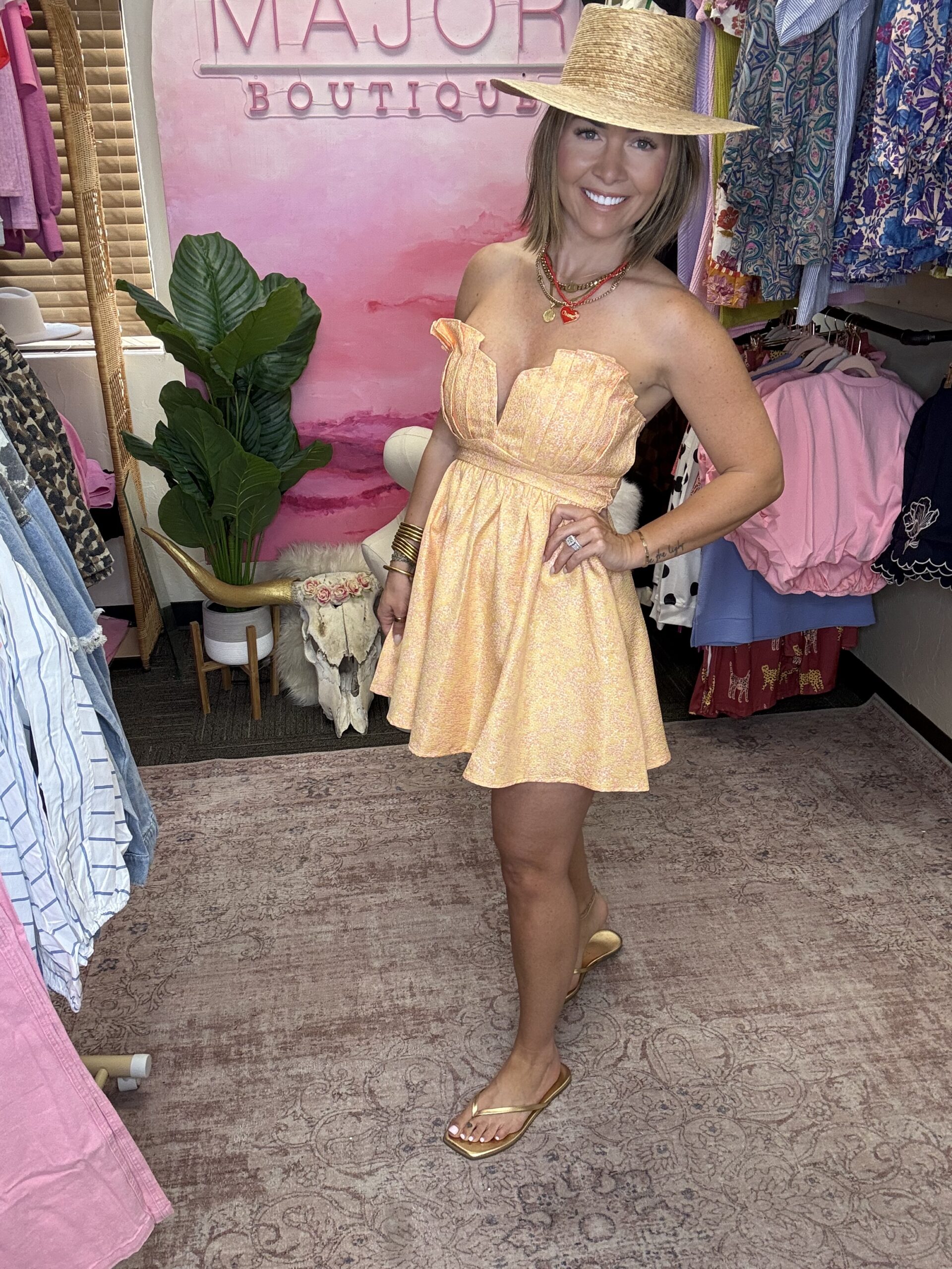 The ultimate flirty little dress. This strapless mini features a structured, sweetheart-style neckline with a statement ruffle detail that adds the perfect feminine touch. The fitted bodice flows into a flattering, twirl-worthy skirt for that effortless, girly silhouette. Finished with a zipper closure in the back for a secure fit. Lightweight and perfect for showers, brunch, vacations, and all your spring/summer events.